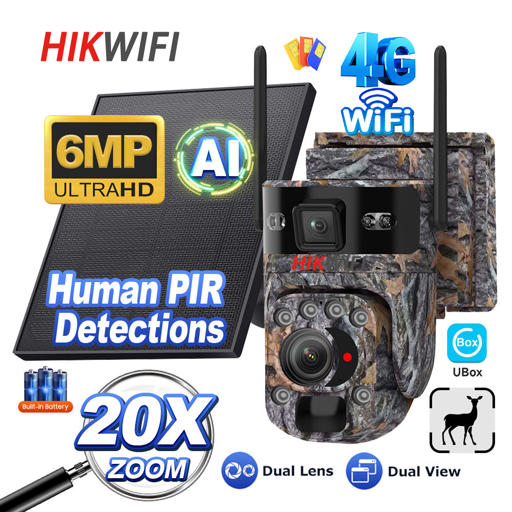 20X Optical Zoom AI 4G Solar Camera Dual Len Camouflage PIR Motion Detection PTZ Camera IP65 Wide Angle GSM CCTV Camera